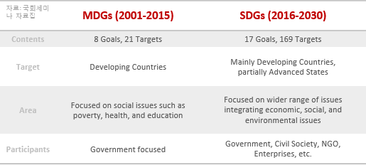 In addition, if MDGs' contents focused on basic goals of human development, focusing on developing countries and poverty, SDGs aim to shift the way they develop, including consumption, life and environment in not only developing countries but also all countries around the world.